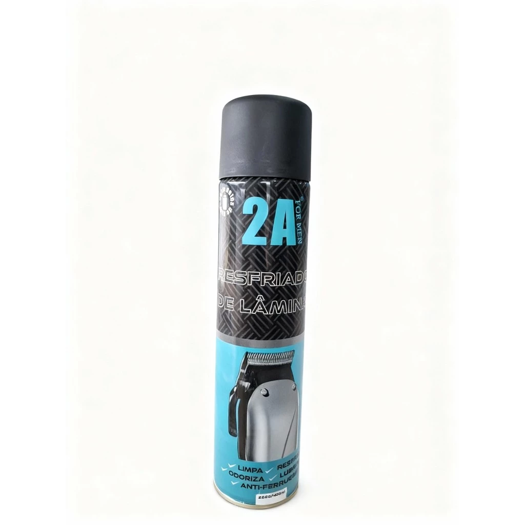 O RESFRIADOR DE LÂMINAS 2A FOR MEN, LIMPA, RESFRIA, OFORIZA, LUBRIFICA, AJUDA CONTRA O ANTI-ENFERRUJAMENTO E POSSUI AÇÃO INSTANTÂNEA. NÃO HÁ NECESSIDADE DE REMOVER A LÂMINA DA MÁQUINA, O SPRAY DE ALTA PRESSÃO COM O JATO SECO, EXPELE RAPIDAMENTE OS CABELOS DOS DENTES DA LÂMINA.